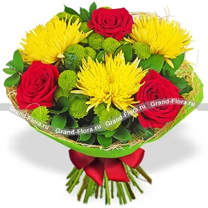 Букет оранжевых роз + хризантемы - Осенний коктейль
