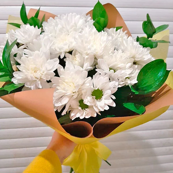 9 хризантем: хризантема кустовая белая (ромашковая) - 5 шт., хризантема кустовая зембла белая - 4 шт.,  рускус, фетр,крафт, бант.