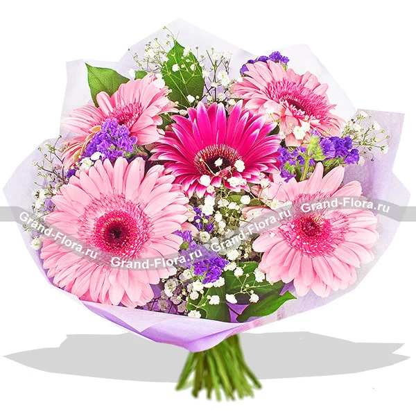 Нежный букет из розовых и малиновых гербер аккуратно оформлен статицей, гипсофилой и декоративной зеленью. Данная композиция будет прекрасным дополнением к подарку дорогой маме, сестре или подруге. Универсальный букет можно вручить как на день рождения, так и без особого повода.