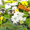 Уменьшенный: хризантема желтая ромашковидная - 2шт., хризантема зеленая (сантини) - 1шт., хризантема белая ромашковидная - 2шт., еловая ветвь, корица, новогодний декор и зелень, сетка.
