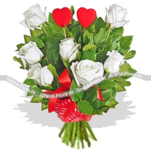11 роз: роза белая - 11 шт., питтоспорум (возможна замена на фисташку) - 3 шт., упаковка, лента.