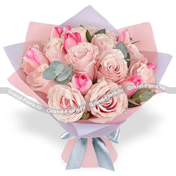 Счастливая весна - букет с розовыми розами и тюльпанами