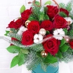 Люкс(на фото): роза красная - 15 шт., хлопок - 5 шт., шарики - 5 шт., декоративная зелень, ель, декор, оазис, коробка.