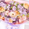 Чарующие и необыкновенные розы сиреневого и кремового оттенка, розовая эустома и фиолетовый лимониум в букете выглядят гармонично, роскошно и привлекательно.